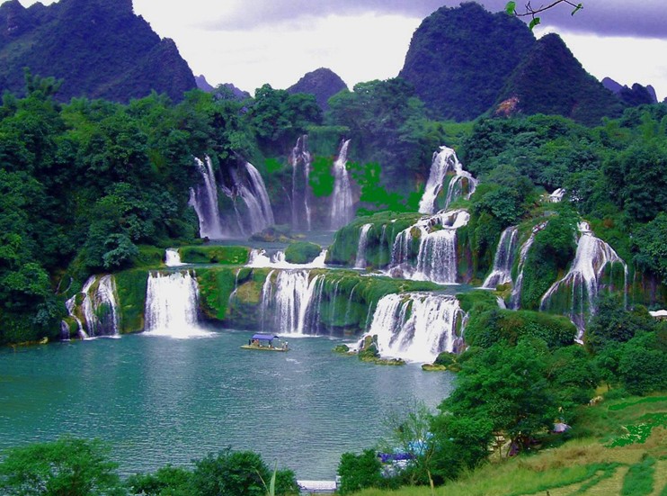 這里一年四季景色各異,雄奇瑰麗,變幻多姿,碧水長流,永不涸歇。春日,紅棉怒放,燦若云霞;夏臨,青峰浴水,花木繁茂;秋至,金風送爽,遍地金黃;冬來,群峰峭拔,山色空濛。無論陰晴云霧,季節(jié)交替,總是各具情態(tài)。五百里畫廊更是一路展開一幅又一幅寧靜抒情的南國風情畫卷。山巒從翠,奇峰錯列,輕紗繚繞,霞落云飛,山影平湖,茂林翠竹,花草掩映,百鳥低徊,綠水梯田,民居水車,小橋流水,耕夫荷鋤,村童在小河中嬉水,竹筏在秀水中穿行……這些如畫美景又豈是簡言陋語能描述、丹青妙手所能繪的呢?來吧,來德天,讓我們拋開一切煩囂,融入這大自然的懷抱!