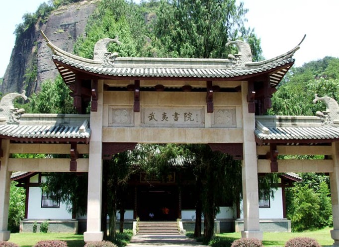 造型莊重、嚴(yán)謹(jǐn)?shù)奈湟纳街祆浼o(jì)念館,是一座于1990年落成的廡殿式大院。館內(nèi)懸掛著新近書寫的匾額、楹聯(lián),其中有不少聯(lián)文,語言精練、寓意深長(zhǎng),文彩斐然。古樸的大門上高懸著一塊大匾,題為“朱熹紀(jì)念館”五個(gè)醒目大字。是方毅同志在武夷山視察時(shí)留下的墨寶,莊重、蒼勁,有書法大家的風(fēng)范。朱熹在武夷山講學(xué)40余年,繼承和發(fā)展了理學(xué)體系。殿前大門兩側(cè)的草書楹聯(lián)表達(dá)了朱熹繼承和發(fā)展的深邃意義。