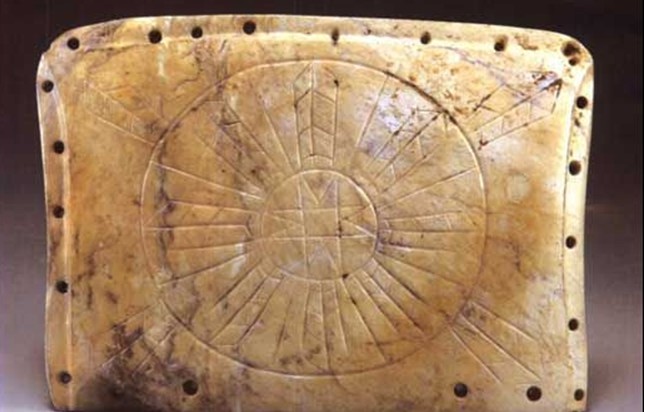 玉版正面為長方形,反面略內(nèi)凹,兩短邊各對(duì)鉆5個(gè)圓孔,一長邊對(duì)鉆9個(gè)圓孔,另一長邊在兩端對(duì)鉆2個(gè)圓孔。玉版中部雕刻有一個(gè)圓圈,圈內(nèi)雕刻著方心八角 星紋;圈外雕一大橢圓形,兩圓以直線平分為八等分(每等分雕刻一圭形紋);在橢圓外沿圈邊對(duì)著長方形玉版的四角各雕刻一圭形紋飾。版權(quán)所有山東聊城聊之旅國際旅行社有限公司,轉(zhuǎn)載必究!這塊玉版上雕刻的紋飾,反映了5000年前凌家灘先民的原始哲學(xué)思想,即圓中心的八角星紋應(yīng)代表太陽;小圓圈外、大圓圈之內(nèi)的八個(gè)圭形紋飾應(yīng)是表示東、西、南、北和東南、東北、西南、西北等八方;大圓圈外四角的四個(gè)圭形紋飾應(yīng)是表示四維。四維和八方,可能就是《史記•龜策列傳》中記載的所謂“四維已定,八卦相望”。按照凌家灘遺址的年代推測(cè),玉版應(yīng)該是“三皇”時(shí)代的原始八卦圖。