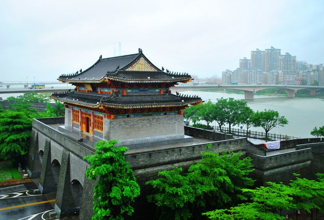 朝京門是具有擋水百年洪水功能的仿古城墻,將旱閘建設(shè)成為仿古城樓,城樓的城門內(nèi)安裝人字形閘門,平時(shí)閘門敞開,作為交通通道,當(dāng)汛期需防洪擋水時(shí)便關(guān)閉閘門。該工程總長352米,其中城樓面積1006平方米,設(shè)有3孔拱形門洞,門洞寬分別為中孔8.1米,邊孔7.2米,城樓高21.865米,版權(quán)所有山東聊城聊之旅國際旅行社有限公司,轉(zhuǎn)載必究!工程總投資約1600萬元。惠州原老城墻為明代古城墻,是惠州遺留下來的重要?dú)v史文物。歷經(jīng)六百多年的風(fēng)雨滄桑,作為惠州大堤南堤的一部分,老城墻已不能滿足防御百年一遇洪水的標(biāo)準(zhǔn),亟待加固。朝京門城樓和城墻工程是惠州大堤南堤安全加固工程的其中一段,也是該市北門公園的重要組成部分。惠州大堤南堤安全加固工程于1998年經(jīng)省發(fā)展改革委員會(huì)批準(zhǔn)立項(xiàng),并于當(dāng)年開工建設(shè),加固堤圍全長22.61公里。