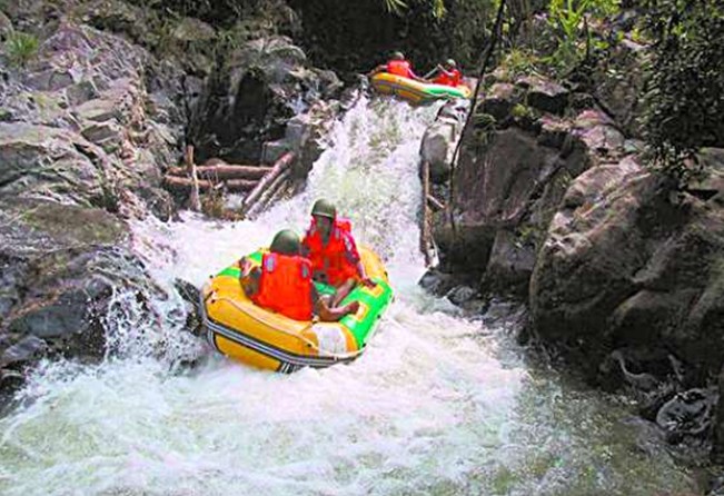 油田礦泉漂流最大的賣點,是其中的高臺沖水之漂,據(jù)聞屬于首創(chuàng)。漂流水道落差變化莫測,漂流者的橡皮筏在急流中時沉時浮,從3米高的水道中飛奔而下,人和筏子沖到水底去了,瞬間又浮現(xiàn)了上來,時而蜿蜒于峽谷叢林,或漂浮于天光云影之間。