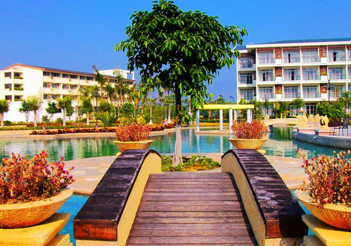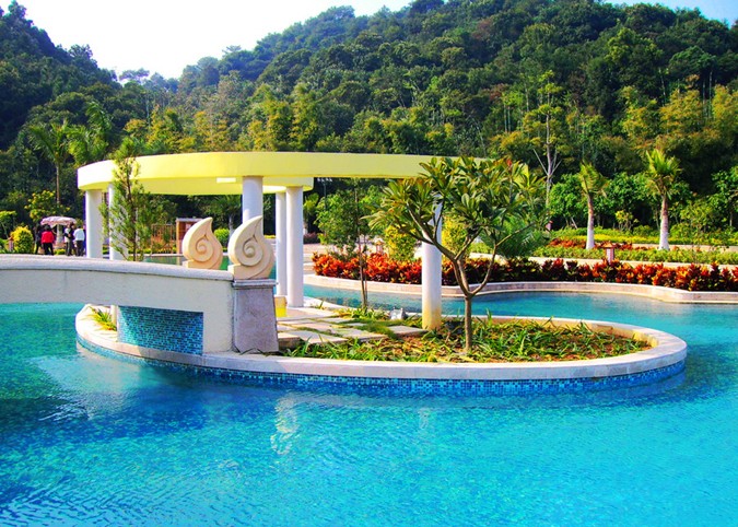 度假區(qū)總占地面積為1000畝。其中首期工程占地面積為500畝,其中設有別墅區(qū)、溫泉區(qū)、餐飲區(qū)、娛樂區(qū)、健身區(qū)、休閑區(qū)等項目。區(qū)內有十分豐富的溫礦泉水資源,溫泉出口處水溫高達82攝氏度,富含大量鈣、鎂、氡等幾十種對人體有益的微量元素,對風濕病、腰肌勞損、腸胃病、神經(jīng)性骨痛等多種潛在疾病有顯著療效。目前該度假區(qū)已完成首期工程,并已于2005年9月26日正式對外接待游客。度假區(qū)內綠樹成蔭,小河流水,小島別墅區(qū)的形狀猶如一把西施扇,把整個度假區(qū)置身于群山的懷抱中。區(qū)內設施配套齊全,目前設有575間客房、31棟別墅、三個中餐廳(同時可容納1650人)、兩個西餐廳、歌舞廳、溫泉大浴池、桑拿,以及為顧客提供咖啡廳、茶藝廊、超市、精品屋、大堂吧、游泳池、桌球室、乒乓球室、羽毛球室、大型的高爾夫練球場、網(wǎng)球場、健身房、沐足等各種服務設施一應俱全。