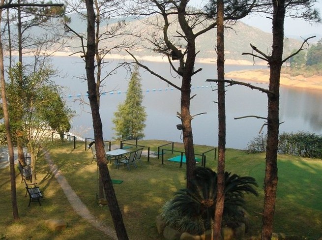 河東名人山莊的高爾夫球練習場就建在湖邊的懸崖上,揮動球桿,小小的高爾夫球成拋物線狀優(yōu)雅地降落在碧綠的湖水里,這種妙不可言的感覺吸引了我們這幫從來沒有接觸過高爾夫球的門外漢。球場旁邊有一片松樹林,林中設有秋千和吊床,睡在吊床上,靜靜地透過高高的松樹看著潔凈如洗的藍天白云,只見遠處山頂一堆蘑菇云慢慢地被風吹著一路往山莊方向飄來,由厚變薄、由濃變淡,漸漸地變成羊毛般的云絮,隨著溫暖的春風飄舞浮動,直至飄散、消融。在乒乓球臺前、網(wǎng)球場里,經(jīng)過一輪大汗淋漓的運動之后,再跳進了碧綠的游泳池,一種清涼舒適的感覺必定涌上心頭。