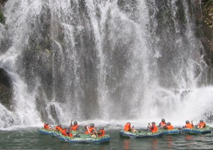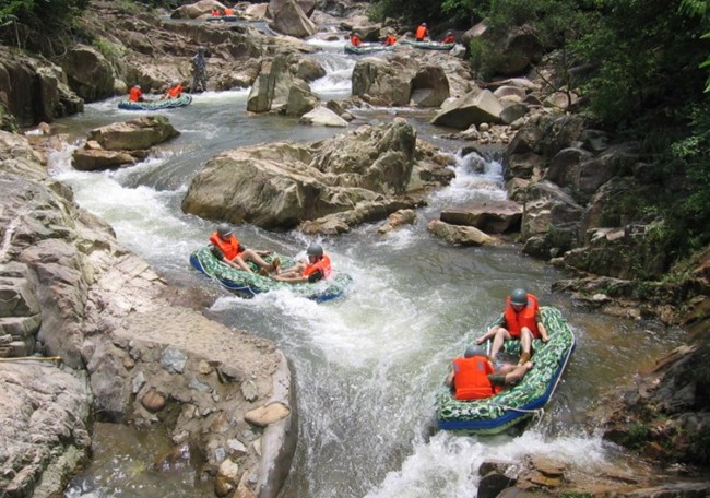 戰(zhàn)船隨著洶涌的河水奔騰而下,峽谷兩側(cè)炮聲隆隆,槍聲不斷,烽煙滾滾,還不時(shí)有敵人憑著叢林和怪石作掩護(hù)向我小分隊(duì)襲擊。當(dāng)然了,我們勇敢的戰(zhàn)士也毫不猶豫地用手中槍(水槍)予以還擊。在不斷的突破、穿越敵陣的緊張征程中,有著革命樂(lè)觀主義精神的戰(zhàn)士們不忘享受穿越激流險(xiǎn)灘時(shí)的激情澎湃和領(lǐng)略漂浮于平緩流水時(shí)兩岸風(fēng)光盡收眼底的詩(shī)情畫(huà)意。順流而下,四周山巒起伏,奇峰異石;峽谷峭巖跌宕,鬼斧神工;河道石貌多姿,溪水清澈;兩岸林茂竹翠,花香鳥(niǎo)語(yǔ);沿途飛瀑奇巖,清溪幽泉,組成一幅美妙的大自然圖畫(huà),恍如置身桃花源中,步入人間仙境。版權(quán)所有山東聊城聊之旅國(guó)際旅行社有限公司,轉(zhuǎn)載必究!經(jīng)過(guò)一個(gè)多小時(shí)的戰(zhàn)火征程,3.3公里的航程,戰(zhàn)友們感受了大地的歡歌、生命的激情,終于完成了任務(wù)(到了總部終點(diǎn))。