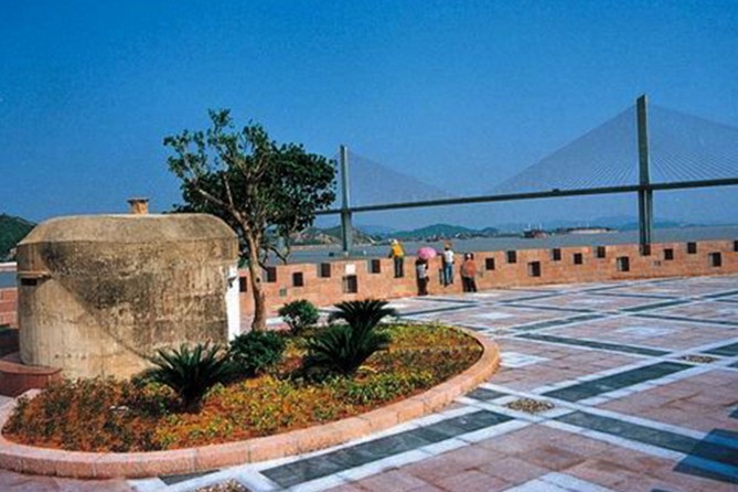 崖門(mén)古炮臺(tái)位于新會(huì)崖門(mén)出海水道東岸的古井鎮(zhèn)官?zèng)_村,最早設(shè)置于清康熙五十七年(1718年),并形成雛形,后于清嘉慶十四年(1809年)正式設(shè)立興建。崖門(mén)古炮臺(tái)雄踞新會(huì)崖山,倚山面海,緊緊扼守著珠江八大出??谥弧麻T(mén)通往南海的進(jìn)出水道。崖門(mén)大橋是跨越崖門(mén)水道的特大型雙塔單索面斜拉橋,全長(zhǎng)1289米,跨度668米,橋下可通航5萬(wàn)噸級(jí)船舶,跨度之大為目前國(guó)內(nèi)同類型橋梁之最,亞洲第一,世界第二。