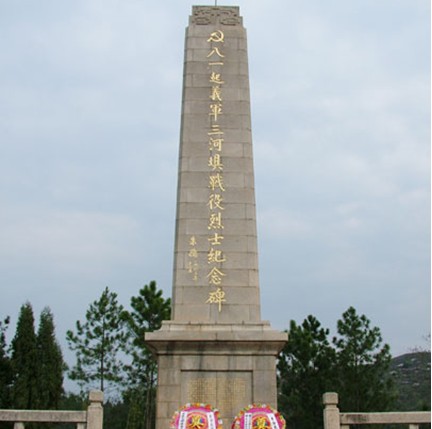 三河壩烈士紀(jì)念碑位于汀江、梅江和梅潭河三江匯合的三河壩。三河壩群峰對峙,地勢險峻,是水陸交通要沖,歷來為兵家必爭之地。南昌起義軍曾在朱德的率領(lǐng)下在這里與國民黨錢大鈞部激戰(zhàn)了三晝夜,許多戰(zhàn)士犧牲在這晨。1964年當(dāng)?shù)卣谌訅螙|岸的筆枝尾山頂建造了15米高的紀(jì)念碑,后來又在左邊建了紀(jì)念亭,現(xiàn)已列為廣東省重點(diǎn)文物保護(hù)單位。