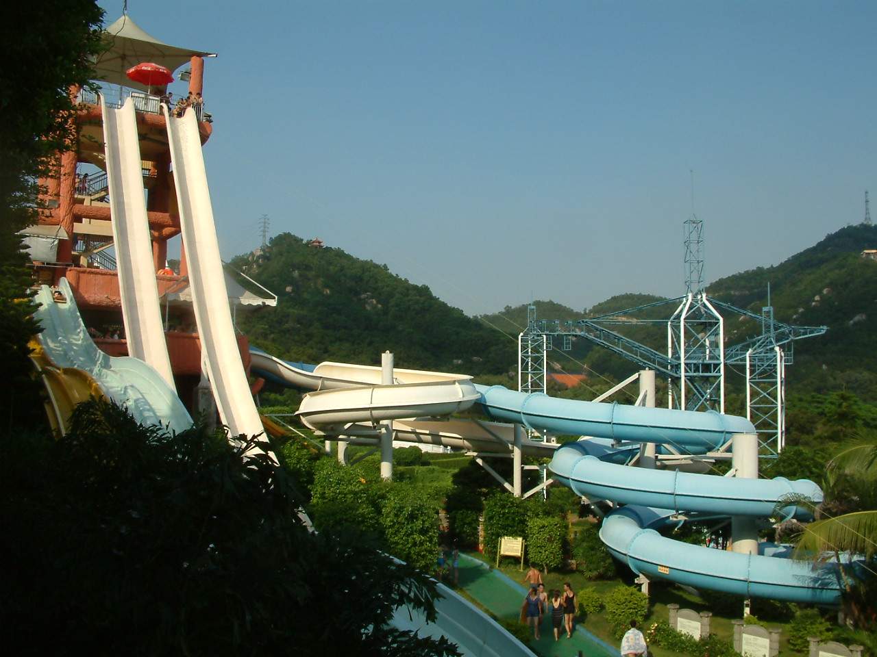 一千零一夜――滑道區(qū)。包括平等競(jìng)賽滑道、螺旋滑道、大型俘筏水滑道和高速滑道。其中高速滑道是兩條并列的高達(dá)8層的樓高的高速滑梯,從頂端滑下來(lái)僅需2.6秒,頗有從云端滑落的感覺(jué)。