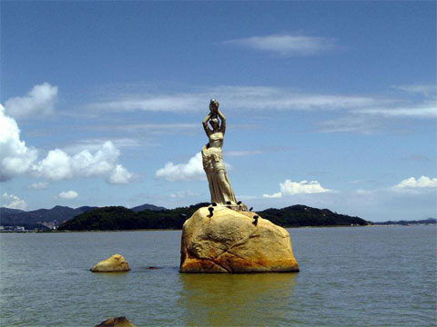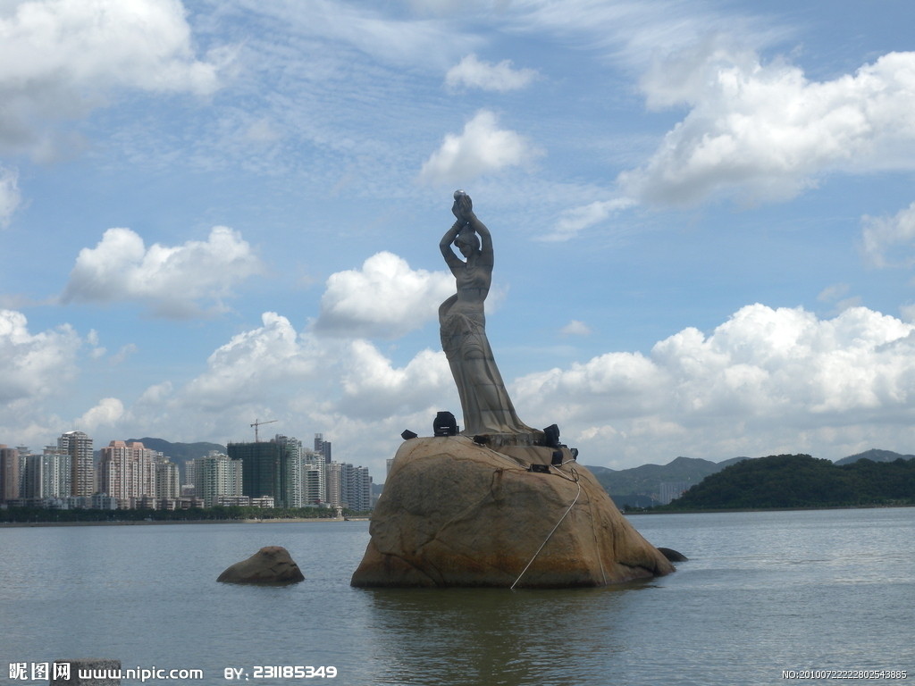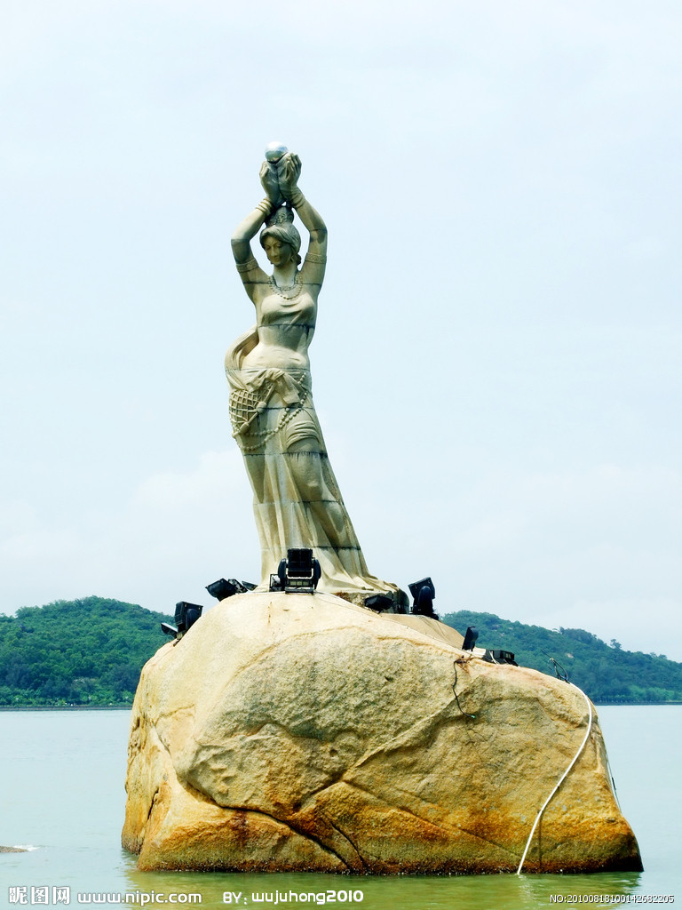 珠海市風(fēng)景秀麗的香爐灣畔,矗立著一尊巨型石雕——珠海漁女,一條美麗整潔的環(huán)海大道——情侶路從她身旁穿過(guò),更使她顯得純潔而大方。她領(lǐng)戴項(xiàng)珠,身掮魚(yú)網(wǎng),褲腳輕挽,帶著喜悅而又含羞的神情雙手高高擎舉著一顆晶瑩璀璨的珍珠,獻(xiàn)給德高望重的九洲長(zhǎng)老,并向世界昭示著光明,向人類(lèi)奉獻(xiàn)珍寶。