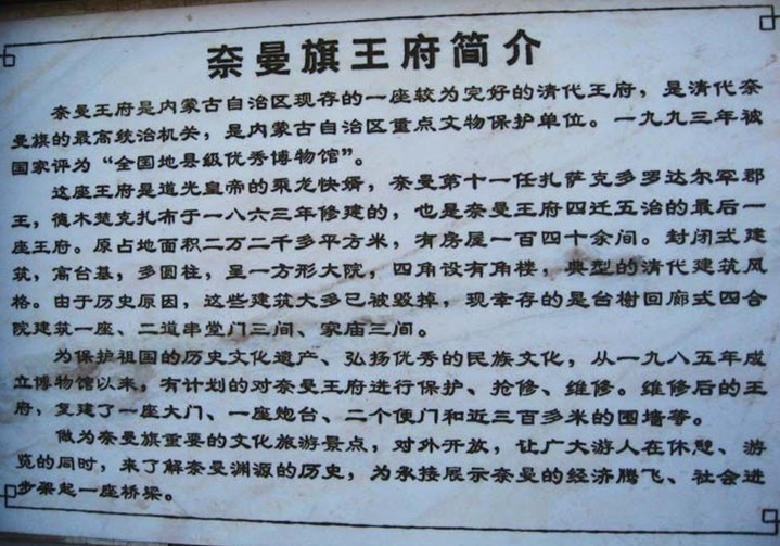 奈曼王府坐落于內(nèi)蒙古自治區(qū)通遼市,始建于清同治二年(公元1863年),為全國重點文物保護(hù)單位。占地面積9997平方米,有房屋190余間,系臺榭回廊式四合建筑。原為奈曼部首領(lǐng)札薩克多羅達(dá)爾漢郡王的府邸,現(xiàn)已對公眾開放。整個建筑風(fēng)格具有鮮明的蒙古民族特色,設(shè)計和布局反映了當(dāng)時王公的尊嚴(yán)和嚴(yán)格的等級制度。