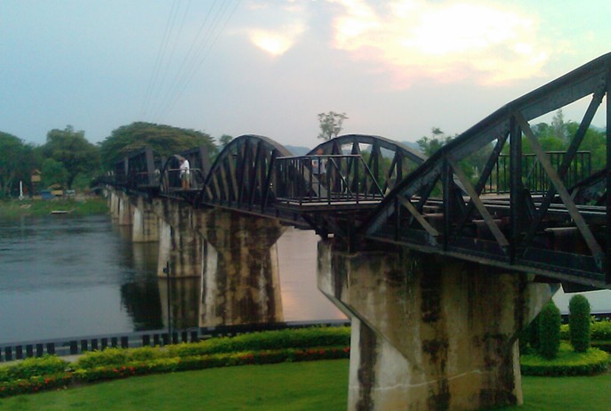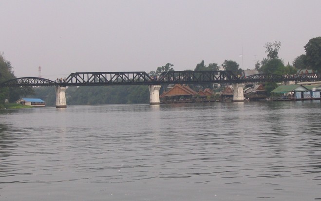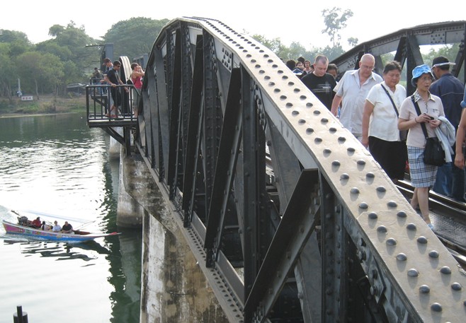 桂河大橋原為木橋,幾經(jīng)飛機(jī)轟炸,早已毀壞,只有在河水很淺時(shí)才能看到殘跡,現(xiàn)在我們看到的是后來修建的鐵橋,它今天還在通車。重建后的桂河大橋,在原來橋的兩側(cè)圓弧鐵架多出了兩段不協(xié)調(diào)的方形鐵架,沒有原先圓弧鐵架的優(yōu)美,很多看過的人覺得不倫不類、不搭調(diào)。桂河大橋大約10分鐘就可以走完,過了橋就是一般的死亡鐵路,一直前行可以通到緬甸。站在桂河大橋的橋頭,看著夕陽(yáng)下靜靜流淌的美麗桂河,使人難以想象這里發(fā)生過的悲慘故事,只有安放在橋頭的美軍投下未爆炸的炸彈提示著我們當(dāng)年那場(chǎng)慘烈的戰(zhàn)爭(zhēng)。