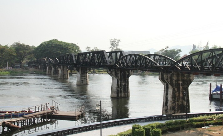 桂河大橋在曼谷西北122公里的北碧府(Kan-chanaburi),這座橫跨桂河的大橋———桂河大橋,折射了二戰(zhàn)期間的一段歷史:當(dāng)年日軍占領(lǐng)泰境期間,強(qiáng)迫盟軍戰(zhàn)俘建造鐵路連接緬甸及暹羅,這條鐵路在犧牲了無數(shù)寶貴性命后才得以完成,故有“死亡鐵路”之稱。桂河大橋就是其中的一段,被稱為“死亡鐵路”的咽喉。大橋的一邊地勢(shì)較為平緩,但一過河便是險(xiǎn)峻的群峰,有的路段甚至就開鑿在懸崖絕壁之上。