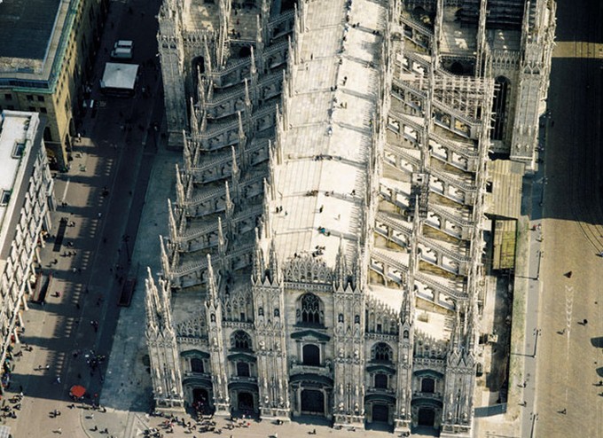 米蘭大堂是世界上最大的哥特式建筑,有“米蘭的象征”之美稱。主教堂始建于1386年,由米蘭望族吉安?維斯孔蒂主持奠基。1500年完成拱頂,1774年中央塔上的鍍金圣母瑪麗亞雕像就位。1813年教堂的大部分建筑完工。1897年最后完工,歷時五個世紀(jì)。1805年拿破侖曾在米蘭大教堂舉行加冕儀式。至1965年教堂正面最后一座銅門被安裝,才算全部竣工。