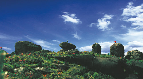 怪石:在海拔700-900米的山間怪石密布,似兔、似龜、似馬、似蛇、似海獅、似大象、似船、似流水、似瀑布、似岸灘,場面壯觀,形成了石的海洋;更有巨巖拔地而起,猶如上天云梯插入云霄,有的山嶺如黃山奇峰險峻異常;也有巨石支點巧妙可人為彈動,別具風趣;又有巖石如溪中?步惟妙惟肖,趣味橫生,確實是一座天然石雕庫。能群觀,可獨賞;能遠眺,可近看,觀感各異,意境深遠,使游者尋味無窮。只要身臨其境,無不浮想聯翩感嘆大自然的鬼斧神工, 使對玉蒼勝景情有獨鐘者不禁發(fā)出“桂林山水甲天下,玉蒼石海甲神州”的贊嘆。