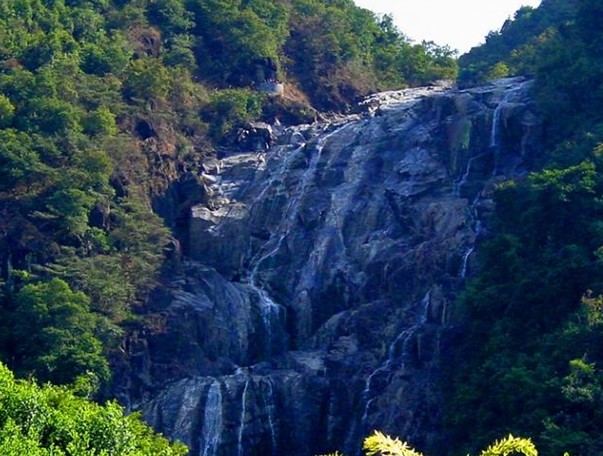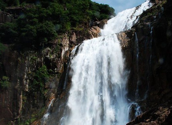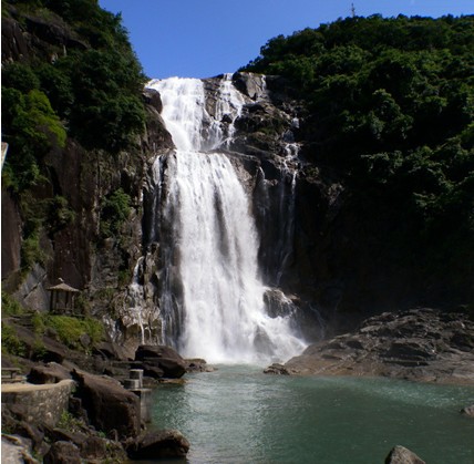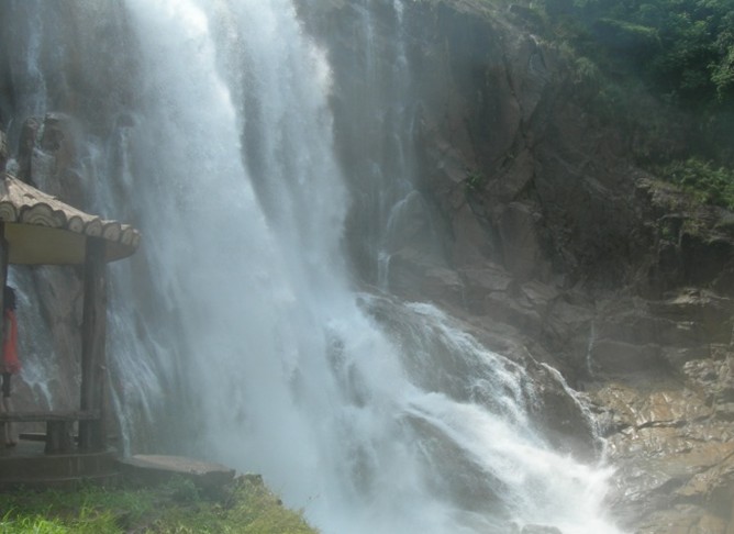 車(chē)子在山腳下停靠后,遠(yuǎn)遠(yuǎn)望去,前面深綠色的山峰上如掛著一幅隱約晃動(dòng)的瑩亮的素色大綢幅,煞是好看。我懷疑那是不是以前的神仙在洞穴前垂掛的珠簾。我們徒步走在崎嶇蜿蜒的山間小路,朝著瀑布前進(jìn)。起初聽(tīng)到的是潺潺的流水聲,越往前進(jìn),水聲越大,嘩嘩直響。幾米、十米、幾十米……素色大綢幅越來(lái)越大,越來(lái)越雄偉,越來(lái)越壯觀。那浩浩蕩蕩的流水,如所向披靡的隊(duì)伍向著前方?jīng)_去。