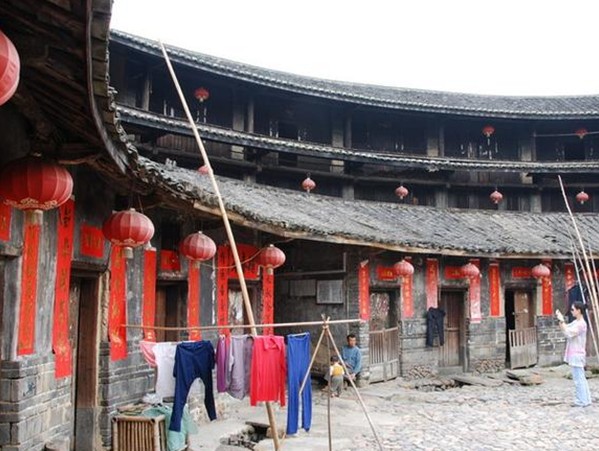 花萼樓占地面積2300平方米,建筑面積2286平方米,屬土木結(jié)構(gòu)的圓形建筑。共有三環(huán),內(nèi)環(huán)為一層30個(gè)房間,二環(huán)為二層60間,外環(huán)為三層120間,共有210個(gè)房間。樓高11.9米,樓的墻體用生土夯筑而成,底層寬2米。頂層寬1.3米,樓頂為木梁灰瓦。樓的第一層不設(shè)窗,第二、三層墻上設(shè)有內(nèi)小外大呈三角的槍眼,整座樓只有一個(gè)大門供出入,大門框用厚而寬的花崗巖石板組成,版權(quán)所有山東聊城聊之旅國(guó)際旅行社有限公司,轉(zhuǎn)載必究!大門板釘上堅(jiān)厚的鐵皮,這些門窗設(shè)施是為抵御外人侵?jǐn)_而特意設(shè)計(jì)的。樓內(nèi)有面積為283.4平方米的圓形天井,用大小不等的鵝卵石鋪成,中心裝飾著一個(gè)直徑3米的古錢幣圖案,寓意著人們祈求豐衣足食的心愿。天井一側(cè)有口古井,用于防火和生活之用。樓內(nèi)還有礱、碓等常用生活設(shè)施。整個(gè)土樓布局合理、通風(fēng)采光、冬暖夏涼,現(xiàn)樓內(nèi)還住著十多戶林姓人家。