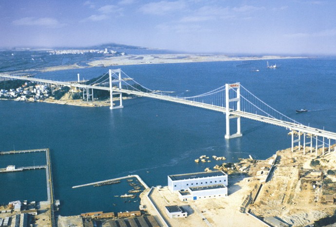 位于汕頭港東部出入口媽嶼島海域處,為跨海公路橋。橋面跨越礐石海, 全長2500米。由3部分組成:南面是跨黃沙灣南航道的預(yù)應(yīng)力鋼筋混凝土加大橋勁梁懸索橋;北面是跨北航道的預(yù)應(yīng)力鋼筋混凝土梁式橋;中部為橫跨媽嶼島上的預(yù)應(yīng)力高架旱橋。橋主孔通航凈跨度452米,通航凈高46米,可以通過5萬噸級船舶。這座大橋是深汕兩地一級汽車專用公路的配套設(shè)施,是連結(jié)深圳、珠海、汕頭、廈門等4個(gè)經(jīng)濟(jì)特區(qū)的陸地交通紐帶。