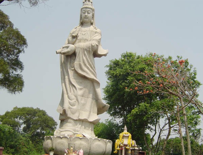 它落成于1994年5月29日,雕藝高超,面容端莊,惟妙惟肖,其左手拿甘露瓶,瓶口向下;右手執(zhí)柳枝,拈露灑人間,形象動人。這座高達12米(含蓮座2米),由總重10多萬公斤108塊石雕砌成,當時是由市工藝美校設計,惠安縣石雕高手刻后遠途載來。其左豎一石燈。又有冊形石板刻著詩僧定持所書二詩,韻妙墨妍。