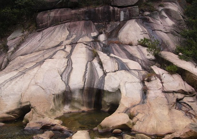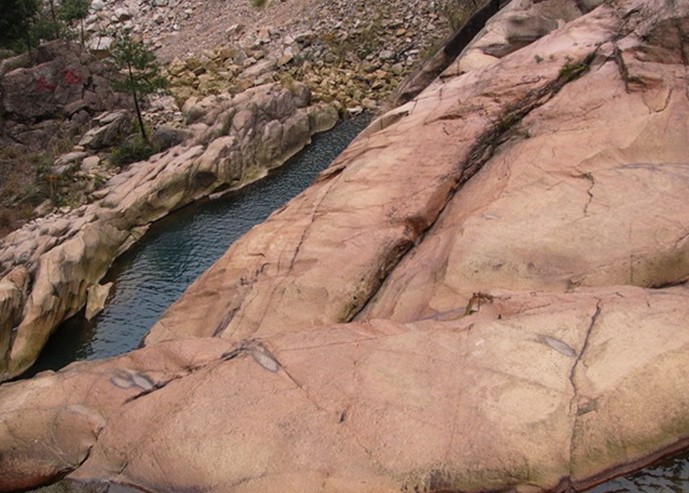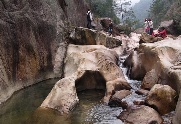 奇石群:數十塊10—50噸的巨石,經過百萬年水的沖刷,表面紋理不一,有似魚鱗、浮雕、地圖等,其中有一塊酷似毛澤東的狂草手書。