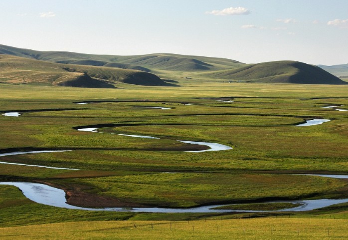 要說莫爾格勒河最美的地方當(dāng)數(shù)中下游的草原地區(qū)。藍(lán)天,白云,青山,碧水,百花爛漫,綠草如茵,莫爾格勒河在無垠的草原上九曲回腸地轉(zhuǎn)了無數(shù)道彎,撫挽滋潤著風(fēng)光秀美的牧場,猶如一幅美麗的風(fēng)景畫;而河邊飄著炊煙的蒙古包,游動著的牛馬羊群,又給畫面增添了無限生機(jī)。