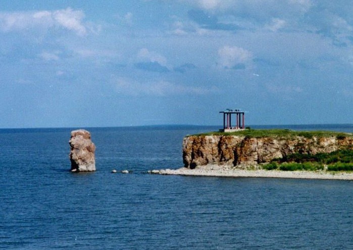 成吉思汗拴馬樁位于呼倫湖西岸,距阿鎮(zhèn)所在地東北38公里,離滿洲里市88公里,是一處三面環(huán)水的峭壁。南臨一湖碧水,石壁嶙峋峭拔,光滑如刀削;北、東面呈陡坡,下臨湖灣;只有西部為緩坡與湖岸相連。山頂上有一座涼亭,山崖東方10余米的湖水里,有一座高10米左右、周長20余米左右的柱石突兀而立。柱石呈不規(guī)則形,上細下粗,石紋條條,縱橫交錯。石縫間筑有鳥巢,時有水鳥飛出,盤旋湖上。