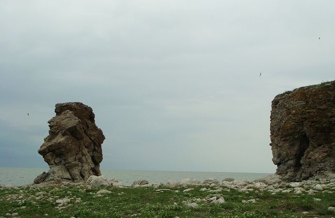 成吉思汗拴馬樁 - 風景成吉思汗拴馬樁位于呼倫湖西岸, 距新巴爾虎右旗所在地阿拉坦額莫勒鎮(zhèn)38公里,離滿洲里市88公里,是一處三面環(huán)水的峭壁。南臨一湖碧水,放眼望去,石壁嶙峋峭拔,光滑如刀削;北、東面呈陡坡,下臨湖灣,只有西部為緩坡與湖岸相連,山頂上有一座高大的涼亭。