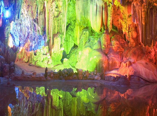 進(jìn)入洞口的第一景就是古佛殿,由石幔、鐘乳石組成的獨具一格的佛殿內(nèi),三座小石筍錯有致,恰似三尊佛像。他們相貌莊嚴(yán)而又安詳,殿內(nèi)佛光普照,令人肅穆。離佛像10米處有一石柱如巨大的古榕,挺撥聳立,枝葉繁茂,被稱為 “古榕疊翠”。古榕底下是三五成群的“牧童”牽著“牛群”,踏著斜輝歡樂而歸。古榕的旁邊還有一個通天幽洞,大洞疊著小洞,給這美妙的景色又增添了一層神秘的色彩。 穿過石巷曲徑,便到了觀音殿。只見一座白色石筍,如一座盛開的荷花,花中坐著慈目低垂的“觀音”菩薩。觀音旁邊那座石筍象是抱著孩子的送子娘娘。周圍無數(shù)的小乳石就象一群群前來朝拜的仙人。其中一尊如太白金星在拱手相迎。所有這些形象生動地構(gòu)成了一個“紫竹松林”的境界。在觀音殿對面是蓬萊仙島的奇異景觀,蓬萊是傳說中的海上仙山,它奇特之處在于海上出現(xiàn)的海市蜃樓景象。這里的景色海天茫茫,空照澄碧,遠(yuǎn)方的海市隱約可見,那紅色呈拱狀的地方象是一座城門,里面各式建筑星羅棋布,景象萬千。