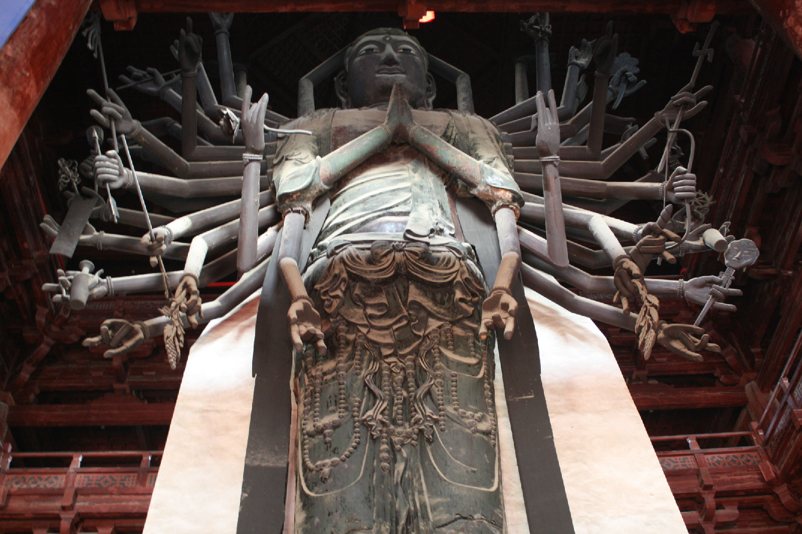 大悲閣是隆興寺的主體建筑,坐落在中軸線後部。閣前古柏參天,閣後老槐吐翠,周圉蒼松、百花環(huán)繞,景色清幽宜人。閣高33米,面闊七間,進深五間,為五重檐三層樓閣。舊名“佛香閣”、”天寧觀音閣”。據(jù)記載,該閣始建于968-976年(宋初開寶年間)。大悲閣內(nèi)矗立著一尊高大的銅鑄大菩薩,稱“大悲菩薩”,高19.2米,立于2.2米高的須彌石臺上,是中國保存最高的銅鑄觀音菩薩像。像奉宋太祖趙匡胤敕令而造,周身有42臂,又稱“千手千眼觀音”。各臂分持日月、凈瓶、寶塔、金剛、版權(quán)所有聊城聊之旅國際旅行社有限公司,轉(zhuǎn)載必究!寶劍等,可惜兩側(cè)4o雙銅手臂均被毀,已改為木制,僅前胸兩臂為原鑄。觀音像神態(tài)自若,比例均勻,衣紋流暢,線條細膩,頗具宋代藝術(shù)風(fēng)格。據(jù)寺內(nèi)一通宋碑記載,其鑄造程序是:先鑄好基礎(chǔ),然后分七節(jié)鑄造大菩薩。第一節(jié)鑄下部蓮花座,第二節(jié)鑄至膝蓋,第三節(jié)鑄至臍下,第四節(jié)鑄至胸部,第五節(jié)鑄至腋下,第六節(jié)鑄至肩膊,第七節(jié)鑄至頭部。最后添鑄四十二臂。菩薩的手均為木雕而成,其上裹布,一重漆,一重布,然后用金箔貼成。