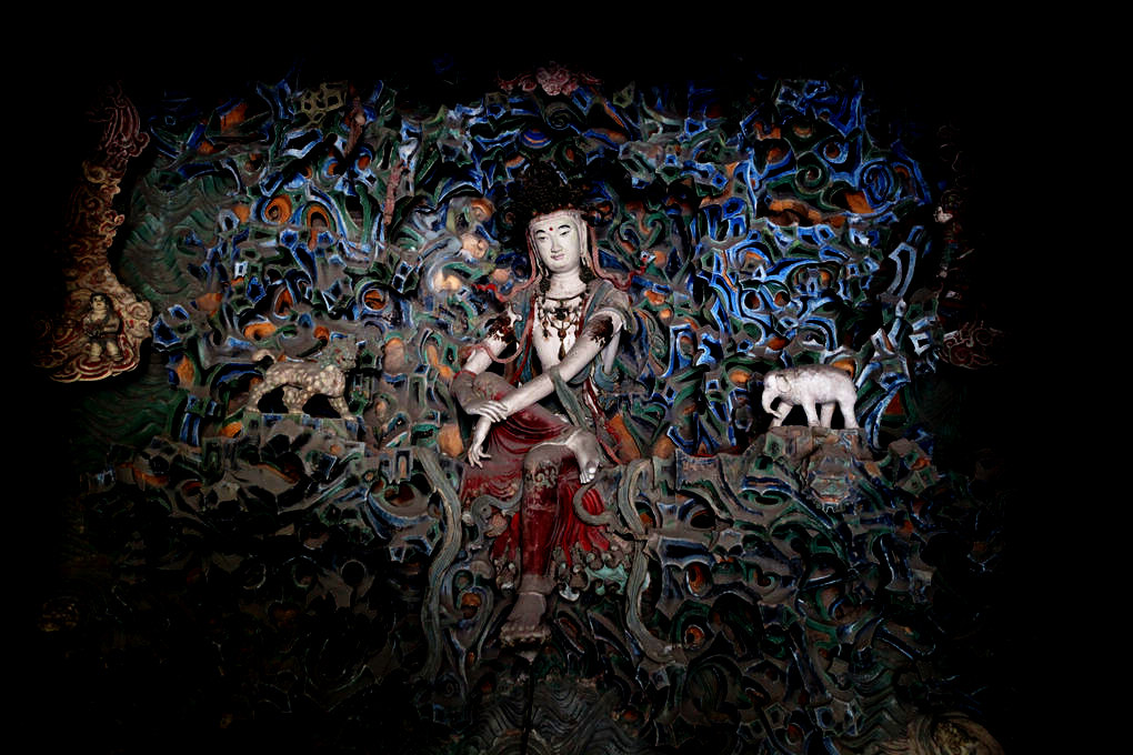 摩尼殿北壁的明代嘉靖年間重塑的通壁懸塑“五彩倒坐觀音”又是寺中一絕。版權(quán)所有聊城聊之旅國際旅行社有限公司,轉(zhuǎn)載必究!“倒坐”是指觀世音不坐在大殿的正中央,而在后壁倒坐,表明觀世音菩薩不渡盡眾生,永不回頭的大慈大悲。整面壁上儼然是一個極樂的世界:在一大片彩色懸雕上,模擬了大海以及海中的普陀仙山,上有修行的凡人,仙人和鳥獸羅列其間。山石突兀起伏,祥云繚繞其間,泉水噴涌,碧波鱗鱗。人物多樣,山中靜修的羅漢和威武的天神各具風(fēng)姿。色彩鮮艷,光彩照人。而最令人仰嘆的則是正中的觀音像。 高3.4米的觀世音菩薩頭戴寶冠,身披瓔珞,面目清秀,微露笑意。稍微下視的眼睛正好與禮佛者仰視的目光相交,設(shè)計十分獨到。觀音菩薩頭戴寶冠,項飾瓔珞,版權(quán)所有聊城聊之旅國際旅行社有限公司,轉(zhuǎn)載必究!帔巾自肩下垂,身著紅色長裙,一腳踏蓮,一腳踞起,兩手自然撫膝,右手搭于左腕自然撫著右膝,頭微右側(cè),身略前傾,呈大自在狀。表情閑適安逸、優(yōu)柔端莊,美感無限。