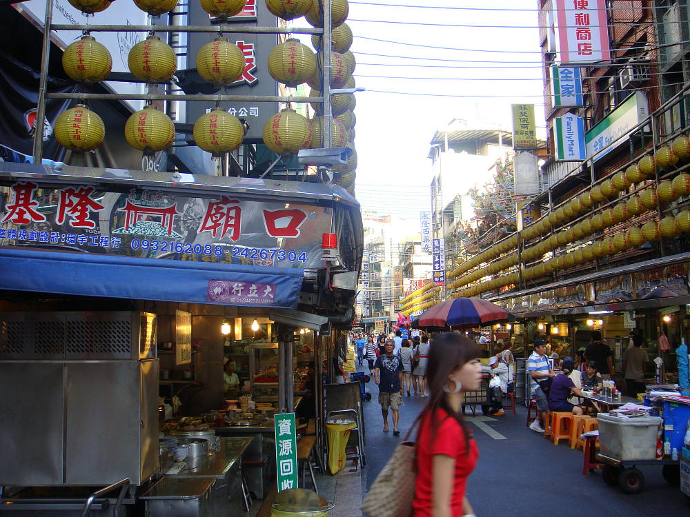 目前的基隆廟口,除了原有于仁三路的小吃攤販區(qū)(狹義的基隆廟口)之外,也與日后逐漸興起的愛四路夜市連成一氣,呈“┘”形狀(橫躺的“L”形)聚集。