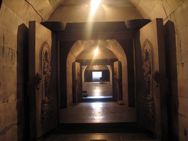 盡管清廷的遺臣為修建崇陵費(fèi)盡心思,光緒還是沒(méi)有能夠在他的地下寢宮里平安地長(zhǎng)眠下去。1931年軍閥混戰(zhàn)時(shí)期,一伙不明身份的兵匪盜掘了崇陵地宮,多數(shù)隨葬品被劫走。1980年6月,經(jīng)上級(jí)批準(zhǔn),清西陵文物管理處開(kāi)啟地宮,清理整修,供國(guó)內(nèi)外游客參觀。這座地宮墓道全長(zhǎng)63.19米,是無(wú)梁無(wú)柱的石拱券式建筑,共有四道石門(mén)、九座券。門(mén)樓、門(mén)垛、門(mén)框、門(mén)簪均用青白石作原料,雕有瓦脊、瓦壟、花瓶等圖案,每道石門(mén)上都有巨大的銅鑄門(mén)管扇,八扇石門(mén)上分別雕有八大菩薩立像,金券內(nèi)有寶床,寶床正中有金井,光緒皇帝和隆?;屎蟮墓讟⊥7旁趯毚采?,棺槨周?chē)杏梦宀世L制的龍山石16塊,寶床前東西各有石座兩個(gè),座上有香箱,是存放“冊(cè)”、“寶”用的。這座地宮雖已被盜,但仍出土珠寶玉翠等文物數(shù)百件。