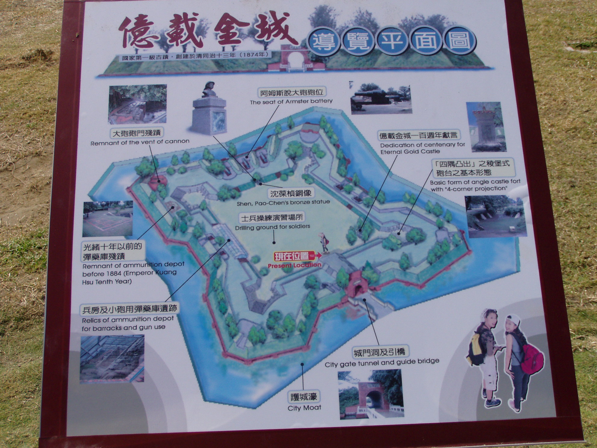 億載金城曾是臺(tái)海安全的重要防線。億載金城高約2公尺,由法國工程師設(shè)計(jì)建造,建材大量取自荒廢的熱蘭遮城(安平古堡)城墻,城垣四周林木茂密,四隅有突出的棱堡,好架設(shè)大炮以利遠(yuǎn)攻,為當(dāng)時(shí)歐洲炮臺(tái)所通行的設(shè)計(jì)形式,城外塹壕圍繞,可將海水引入形成護(hù)城河;城門以紅磚砌成,外額上書“億載金城”、內(nèi)額“中流砥柱”,皆出自沈葆楨手筆。城內(nèi)綠草如茵,平坦寬廣,可見沈葆禎紀(jì)念銅像。黃昏時(shí)分,在河道口中望城內(nèi)夕陽西下、晚風(fēng)徐來,令人發(fā)思古幽情。