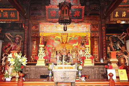 大天后宮為三進門式。由大門朝里望,透過三進逐次升高的天井和房舍狹長的空間,可以遙見那香煙繚繞、金黃帷幕下的全身媽祖神像。媽祖慈眉善目,神態(tài)安詳。據(jù)說媽祖原來是粉紅面,但經(jīng)百年來受香火的薰繞,現(xiàn)在看到的媽祖已成了黑色的“香煙面”了。兩旁配祀千里眼、順風(fēng)耳二將的泥雕,表情細膩,體態(tài)生動,古銅色的肌膚、一塊塊突起的肌肉,顯得極為兇猛威嚴,雕刻精細入微,栩栩版權(quán)所有聊城聊之旅國際旅行社有限公司,轉(zhuǎn)載必究!如生,實為雕刻精品。兩邊的神龕里還供奉著東、西、南、北四海龍王和水仙尊王。神奇古怪,嶙峋不凡,也都被煙薰成了黑臉。這些都是與海上的航海、救難有關(guān)的神。該廟還有一個特色就是除了正殿的媽祖稱為大媽外,還配有所謂的“二媽”、“三媽”的媽祖神像,造型僅為大媽的一半,臉色為粉紅色,兩眼張開,與媽祖神像眼瞼呈下垂?fàn)畈煌?/p>