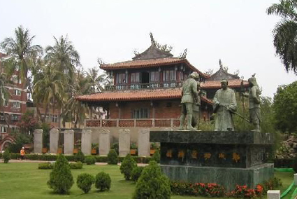 1862年(清同治元年)毀于大地震,光緒年間在廢墟上建文昌閣、海神廟等,即今日的赤嵌樓。樓內(nèi)陳列著荷蘭人投降的條約書,以及鄭成功與荷軍作戰(zhàn)的海圖等珍貴歷史資料。城樓下排列著九座巨大貝屃碑趺的石碑,為乾隆皇帝所賜,上面刻有乾隆親撰的碑文。赤嵌樓的樓上,尚有巨炮及瞭望臺(tái)的遺跡。樓前廣場(chǎng)中心建有鄭成功接受荷軍獻(xiàn)降書的雕塑群像。這受降圖是勝利的象征,顯示了中華民族的雄風(fēng)。
