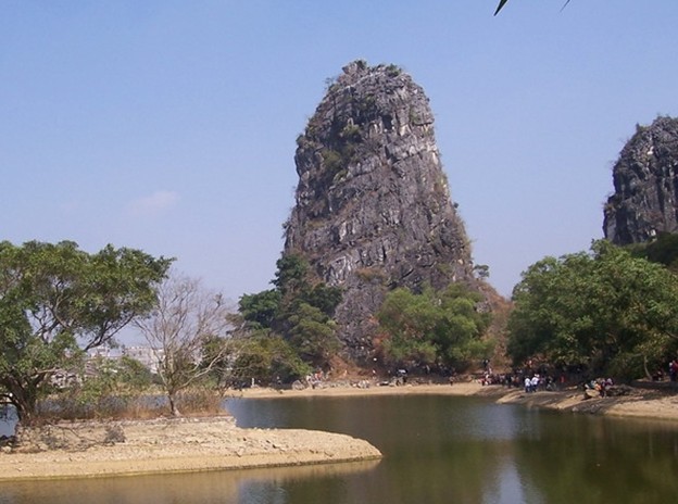 湖水中獨立一柱,風光旖旎,湖畔繞疇,湖岸垂柳依依,“通天蠟燭”破水而出,直向藍天伸長,形如石山,仿如巨燭。用“拔地攀天起,一柱乾坤連”來形容其氣勢磅礴,恰如其分。峰聳湖畔,倒映湖中,花樹掩映,湖光山色,融為一幅秀麗非常的水墨山水畫。身歷其境,你會驚嘆造物主的鬼斧神工。每到春夏之交,滿山樹木的碧綠與湖邊楊柳暉映成趣,湖中泛舟垂釣,就象置身于桂林山水之中,令客留連忘返。