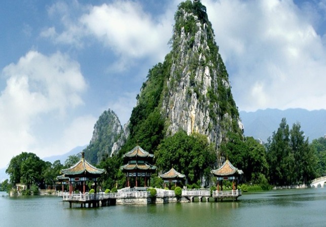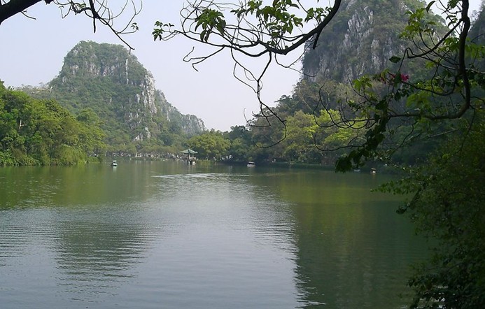 肇慶七星巖位于肇慶市區(qū)北約2公里處,景區(qū)由五湖、六崗、七巖、八洞組成,面積8.23平方公里,湖中有山,山中有洞,洞中有河,景在城中不見城,美如人間仙景。七星巖以喀斯特溶巖地貌的巖峰、湖泊景觀為主要特色,七座排列如北斗七星的石灰?guī)r巖峰巧布在面積達(dá)6.3平方公里的湖面上,20余公里長的湖堤把湖面分割成五大湖,風(fēng)光旖旎。被譽(yù)為“人間仙境”、“嶺南第一奇觀”。國級文物保護(hù)單位七星巖摩崖石刻是南中國保存得最多最集中的摩崖石刻群,所以取名為七星巖。為5A級旅游景區(qū)七星巖主體由閬風(fēng)巖、玉屏巖、石室?guī)r、天柱巖、蟾蜍巖、仙掌巖、阿坡巖(又稱禾婆巖)七座石灰?guī)r山峰組成,排列如北斗七星般撒落在碧波如鏡的近600公頃湖面上。星湖原是由西江古河道形成的瀝湖,20多公里長的林蔭湖堤,如綠色帶飄般把仙女湖、中心湖、波海湖、青蓮湖和里湖連結(jié)在一起,湖光山色,綽約多姿。