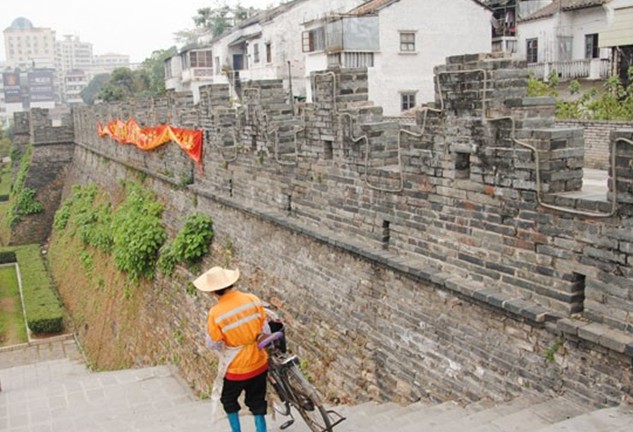 廣東僅存的完整古城墻,位于肇慶市區(qū)內(nèi)人民南路一帶,始建于宋代,呈長方形,周長280 .2米,制高點(diǎn)在城北披云樓。目前城墻高出地面10米,城墻兩側(cè)由磚砌成,中間夯土,外圍共有28個城垛,城磚規(guī)格達(dá)40多個品種,是歷史上曾多次修葺的見證。當(dāng)年廣西壯族首領(lǐng)儂智高反宋,端州太守丁寶臣因無城墻防守,棄城而逃。儂智高失敗后,官府于公元1053年始筑土城墻,至明末共修城墻十一次。