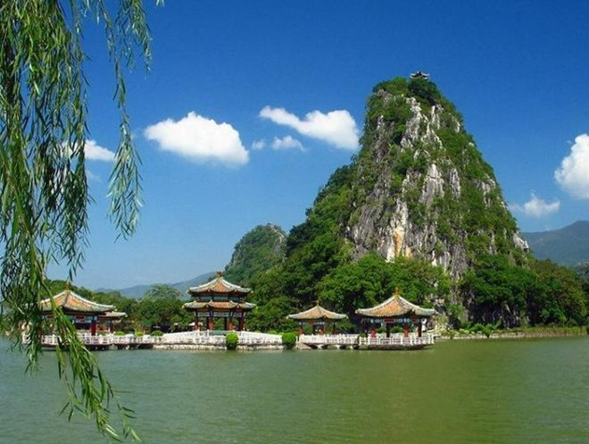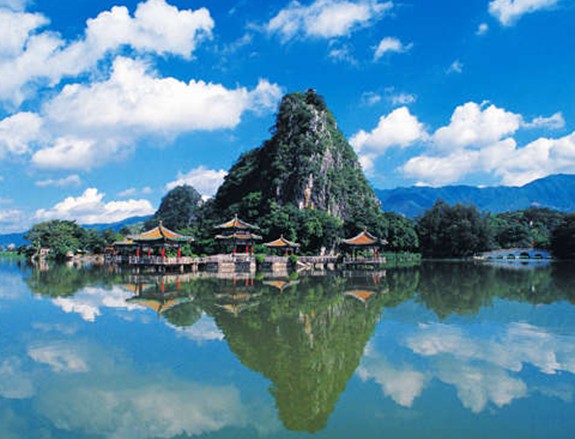 廣東肇慶市的星湖風(fēng)景名勝區(qū),是我國(guó)南方著名的旅游勝地。很多游人對(duì)它評(píng)價(jià)很高,認(rèn)為它兼有杭州西湖和廣西桂林的勝景。
