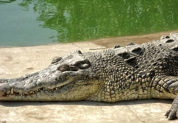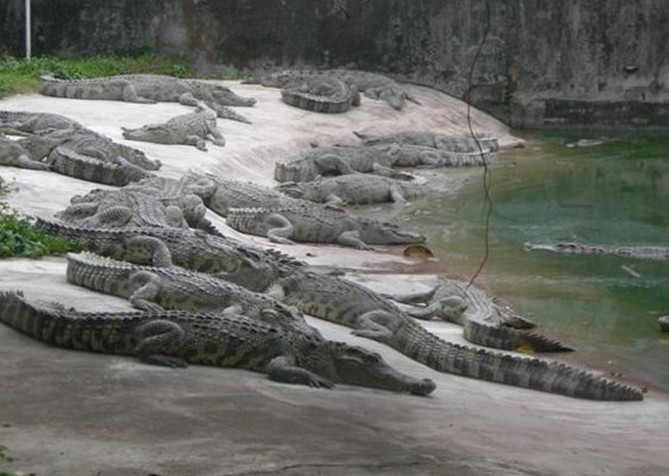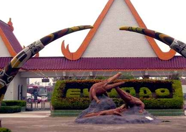 在白藤湖內(nèi)尖峰橋湖心路口即可望到鱷魚島那金碧輝煌,巍峨壯麗的泰式門樓,門前寬廣的停車場(chǎng)可一次性停放上百輛大巴,進(jìn)入大門后,有一個(gè)十分醒目、高達(dá)4米的大型鱷魚雕像——“鱷魚一家”吸收不少游客紛紛在此攝影留念,離雕像百米處,十多個(gè)鱷魚池座落在鮮花叢中、綠茵地上、池中養(yǎng)有我們祖先稱為“噴火龍”、“鮫龍”的楊子鱷、泰國(guó)灣鱷、馬來鱷、雜交鱷等四個(gè)品種,大小近千條,最小的有剛出殼的幼鱷,體型最大的有4米多長(zhǎng),重達(dá)千斤。