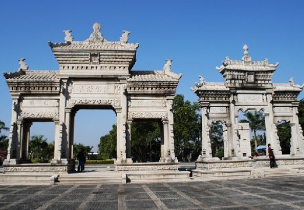 梅溪牌坊在珠海市前山鎮(zhèn)梅溪村。清光緒帝為旌表當(dāng)?shù)剜l(xiāng)紳、首任清政府駐檀香山總領(lǐng)事陳芳及其父母等人造福桑梓于十二年(1886年)和十七年共賜建牌坊4座,現(xiàn)存的3座牌坊并排而立。牌坊集西方的裝飾風(fēng)格和傳統(tǒng)的中國(guó)建筑結(jié)構(gòu)為一體,中西合璧,巍峨壯觀,工藝華美,是華南地區(qū)罕見的古建筑,也是珠海有名的十景之一。