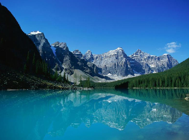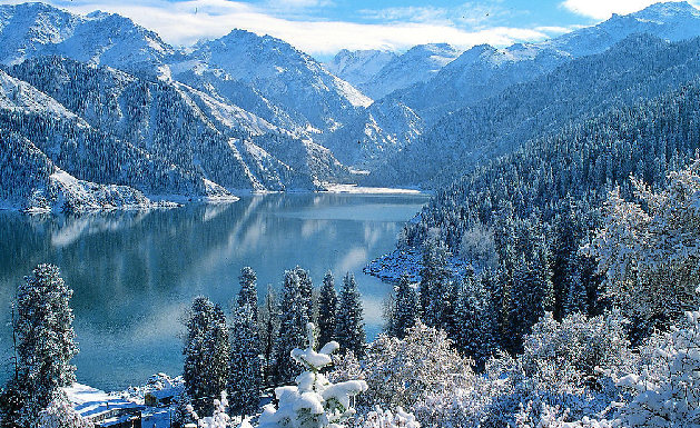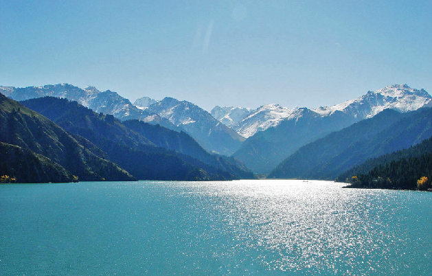 天池東南面就是雄偉的博格達主峰(蒙古語“博格達”,意為靈山、圣山)海拔達5445米。主峰左右又有兩峰相連。抬頭遠眺,三峰并起,突兀插云,狀如筆架。峰頂?shù)谋ǚe雪,閃爍著皚皚銀光,與天池澄碧的湖水相映成趣,構成了高山平湖綽約多姿的自然景觀。