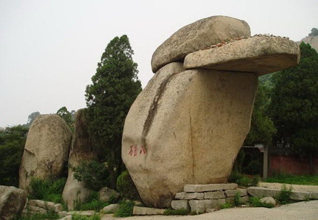 八卦石 八卦石是古代嶧山的五大奇觀之一。奇就奇在這兒原來有八塊大石頭,由東向西依次排列,高度相當(dāng),每塊石面都有斷紋。八塊石頭的斷紋正好與《周易》八卦的卦爻相吻合。非??上У氖?,清雍正四年(1726年)修奎星閣毀掉了幾塊石頭。嘉慶十二年(1807年)拓建通明天宮戲樓,又毀掉了幾塊石頭?,F(xiàn)在只能看到乾、坎、艮三卦的卦爻了。