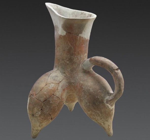 鳥(niǎo)形神器為陶制品,出土于尉遲寺遺址大型廣場(chǎng)的東部的地層中。該器物經(jīng)復(fù)原由3部分組成,最底層為圓柱形,中間是圓錐形,圓錐大頭向下反扣在圓柱上,同圓柱連為一體,在圓錐的兩邊還有兩個(gè)酷似雞冠的飾物,圓錐的頂端是一只像鳥(niǎo)一樣的東西。版權(quán)所有山東聊城聊之旅國(guó)際旅行社有限公司,轉(zhuǎn)載必究!整個(gè)器物通高59.9厘米,底徑16厘米,上徑20厘米,采用手工工藝,紅褐色器表有燒制時(shí)氧化的灰褐色斑塊,頸部以下為空體,器形像瓶,又像一個(gè)長(zhǎng)頸背水壺,主體的象形造型與附加的抽象造型合為一體,結(jié)構(gòu)合理。