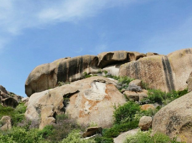 一條國防公路從博樂出發(fā),呈西南--東偏北走向貫穿其中一條較寬山谷--秀女溪谷。進入谷內,有一圓形開闊之處,放眼望去,似用巨石砌成的古堡。版權所有聊城聊之旅國際旅行社有限公司,轉載必究!頂部之石,如炮臺,似望樓;石面之竅,既像獨目嘹望之孔,換個角度,又似天降水滴,故名為“生命之源”。真可謂移步換景!雖處于干旱半干旱地帶,但是怪石峪黃昏后氤氳多云,山谷底有泉流,石石皆有苔蘚,新長者,呈現(xiàn)嫩綠;枯萎者,如涂赭黃;成熟的,似貼黑面。各色相間,布于石上,若古堡斑斕多彩的裝飾,競顯貴者之豪華,王者之氣勢。