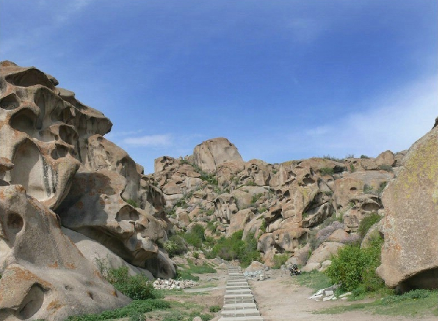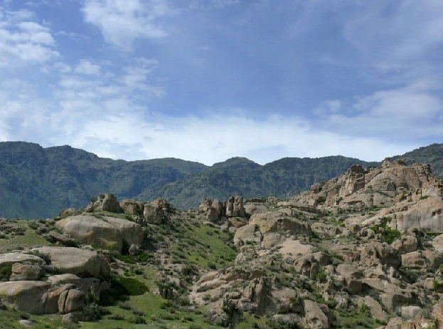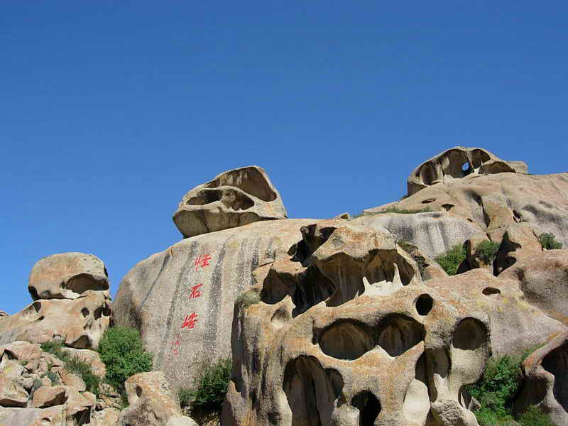 從博樂市北行偏東行38公里,就到了怪石峪。 怪石峪為一峽谷,然谷內無懸崖峭壁,也無峨峰刺天。整個山體,如人工用億萬巨石所砌。所砌之石,皆呈圓角,且有竅孔,石面光滑,無嶙峋之跡,令人稱怪,故稱“怪石峪”。當?shù)毓_克族同胞稱怪石峪為“闊依塔什”,意思是“遍地像羊一樣的石頭”。因為這些光滑的巨石,遠遠望去,如同羊群擠在山坡。