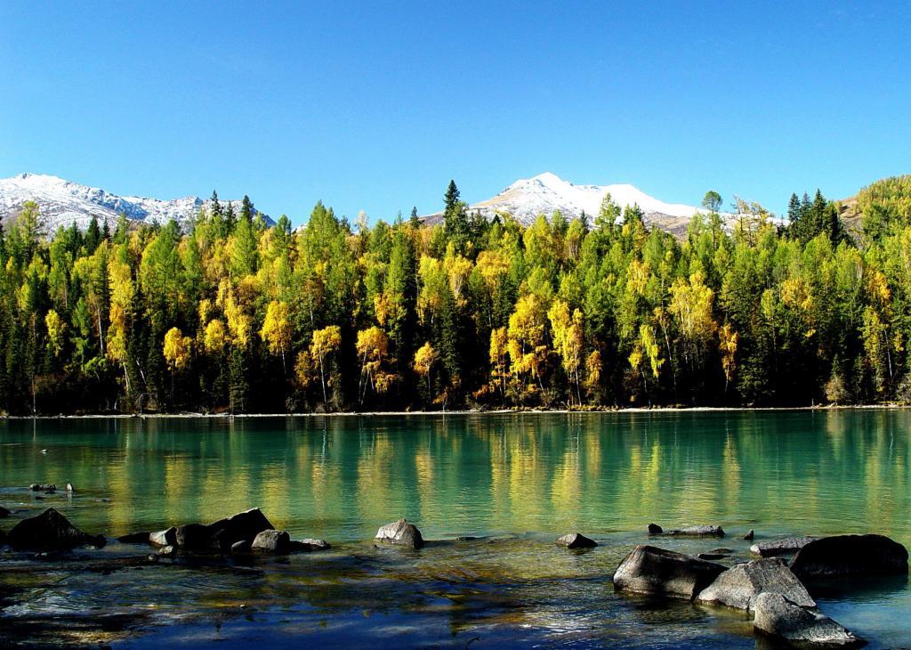 喀納斯湖會(huì)隨著季候和天氣的變化時(shí)時(shí)變換著自己的顏色:或湛藍(lán)、或碧綠、或黛綠、或灰白……有時(shí)諸色兼?zhèn)?,濃淡相間,成了有名的變色湖。受強(qiáng)勁谷風(fēng)的吹送,倒入喀納斯湖的浮木,會(huì)逆水上漂,在湖的上游湖灣處聚堆成千米枯木長(zhǎng)堤,蔚為喀納斯湖的一大奇觀。
