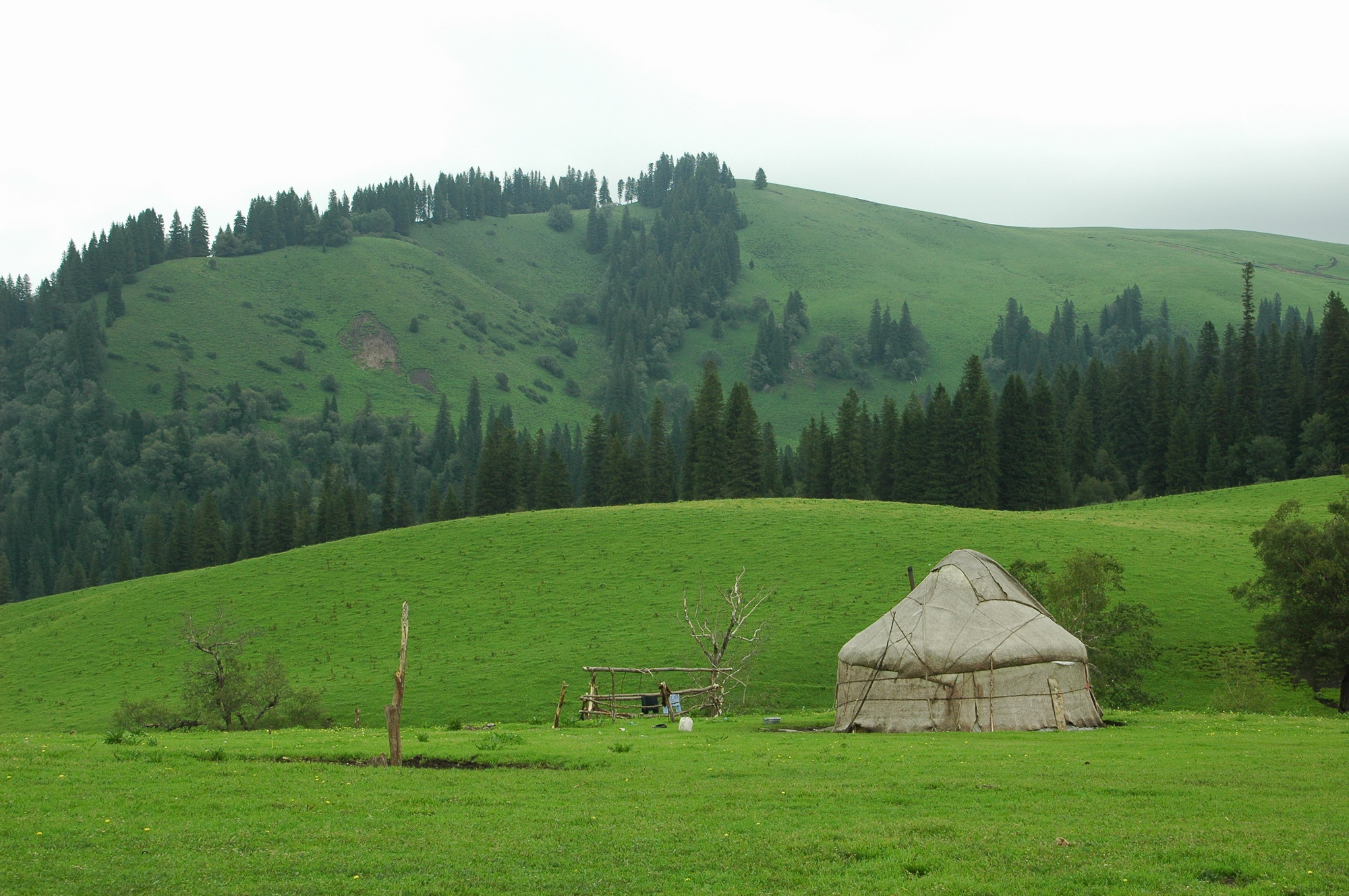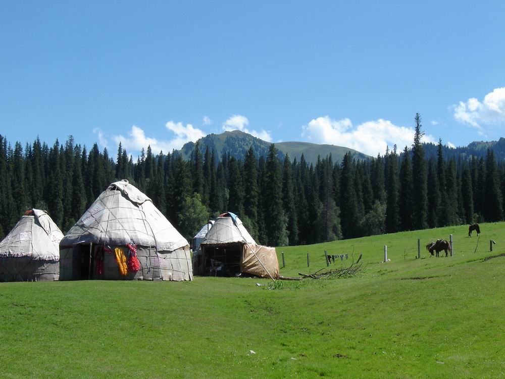 恰普河夏季牧場是名副其實的空中草原,平均海拔在兩千米以上。在景點歇馬臺遠眺,山下蜿蜒西去的鞏爾斯河像一條閃耀銀光的藍色絲帶飄落在寬闊的山谷之中。兩側(cè)重巒疊翠,云靄騰騰。大有“仰天一長嘯,萬里白云來”之勢。舉目藍天如洗,幾羽蒼鷹在悠閑地盤旋。側(cè)目牧草如毯,一群群牛羊在坡地上安逸地徘徊,不時有牧人縱馬馳騁,驚起一片飛鴻……