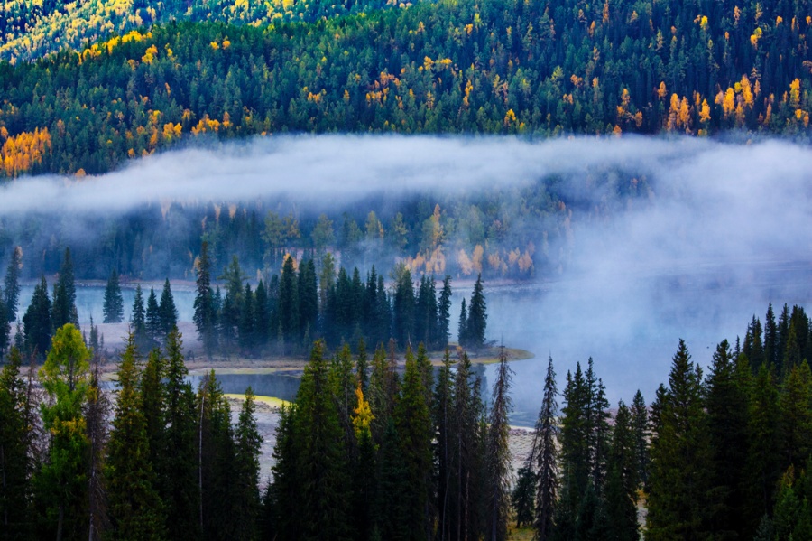 這里的河水將森林和草地分切成一塊塊似連非連的小島,人們稱之為“神仙灣”。它是喀納斯河在山澗低緩處形成的一片沼澤淺灘,從湖面背光處看去,在陽(yáng)光照射下河水流光溢彩,連樹(shù)上的葉子都隨風(fēng)搖曳、閃閃發(fā)光,仿佛無(wú)數(shù)珍珠任情灑落,為此也被稱為“珍珠灘”。這里常有云霧繚繞,山景,湖水,樹(shù)葉相互映襯;綠色的白樺林,湛藍(lán)的喀納斯,紅色的小木屋,超凡脫俗,如夢(mèng)如幻,如臨仙境,神仙灣由此名。
