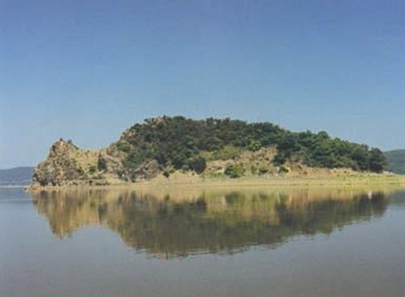 島上樹高林密,樹叉上老鴰巢穴星羅棋布。附近水域里還有鷺鷥、水雞、鴛鴦等水禽,所以此地又是水鳥的樂園。老鴰砬子孤立湖中,呈灰褐色,奇巖怪石堆積的巖崖,險峻陡峭。乘船繞到山背面,再遠(yuǎn)望此山,老鴰山竟又變成了駝山。山前首,光光的砬子恰似光禿禿的駱駝脖子;山后首,駱駝身負(fù)重載地在水里行走,形象逼真,饒有趣味。