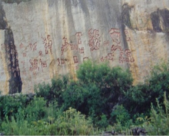 清道光《永寧州志》載:“曬甲山即紅巖后一山也,崔巍百丈。俗傳武侯南征曬甲于此。”又稱“紅巖山”。與關(guān)索嶺對峙,緊靠滇黔公路。從公路到紅巖前,約半公里。 紅崖向西,如墻似屏,長五十余米,高二十余米,呈淺紅色。偏北平整處,有形如古文字、非鐫非刻、非陽非陰的鐵紅色神秘符號書于淺紅巖面。字不成行,排列不整齊,錯落參差,大小不一,共有十九字。大者一米見方,小者十幾厘米。若篆若隸,古樸渾厚。雖經(jīng)風(fēng)雨剝蝕,但其色歷久不退?!栋岔樃尽罚?ldquo;殷高宗石刻,在永寧州(按當(dāng)時州治,即今關(guān)嶺自治縣永寧鎮(zhèn))東五十五公里紅巖山;《永寧州續(xù)志》,諸葛碑“在紅巖曬甲山懸?guī)r上。約二十余字。大者如斗,小者如升。非篆非隸,不可辨認。字若朱畫,并非鐫刻。”