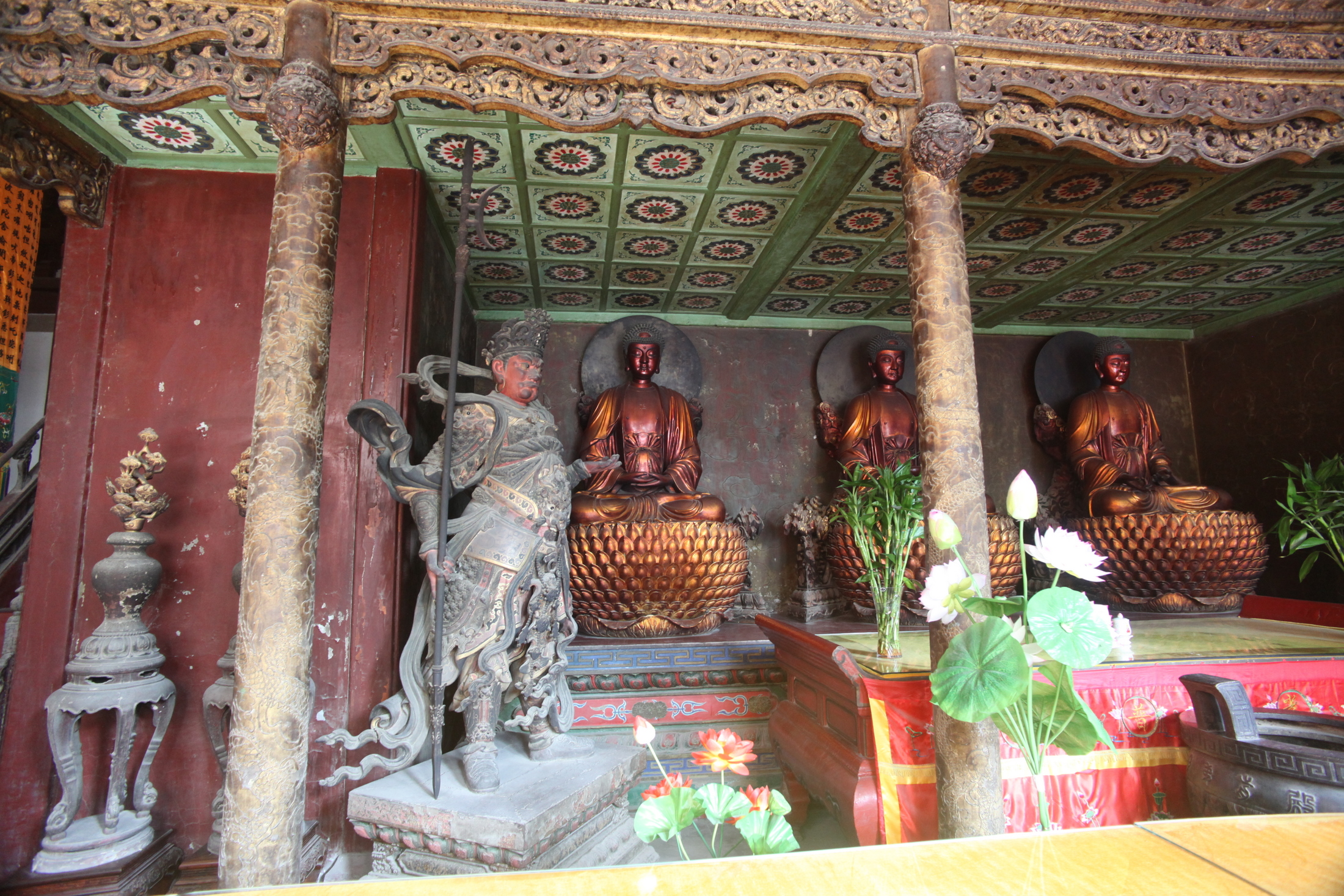 大雄殿后有接引殿,為一般寺院所罕見。長14米,進(jìn)深10.7米。為雙層殿基,是寺內(nèi)最小建筑。殿內(nèi)供西方三圣。中為阿彌陀佛立像,版權(quán)所有聊城聊之旅國際旅行社有限公司,轉(zhuǎn)載必究!左邊為持凈瓶的觀世音菩薩,右邊握摩尼寶珠的是大勢至菩薩,均為清代泥塑。